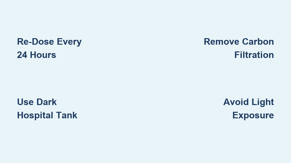 • 12–24 Hours: Critical vulnerability window. Water appears light blue. Therapeutic levels drop below 50%. Perform 15% water change and add 50% of initial dose.