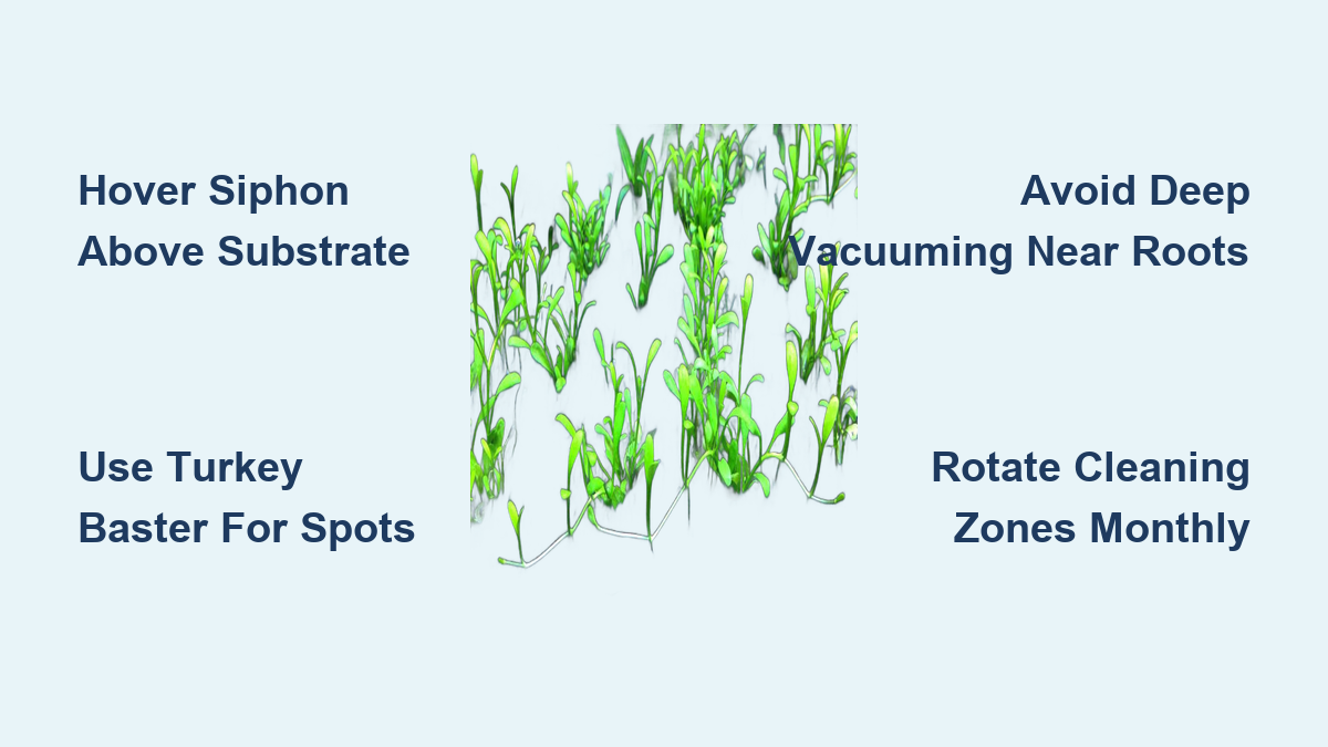 Never use standard gravel vacuums that plunge deep into substrate. Their powerful suction destroys root networks and creates vacuum funnels that destabilize your aquascape.